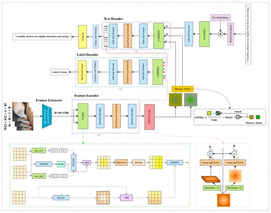 The baseline model in this study is based on the “encoder–decoder” architecture introduced by Vinyals et al. [14]. The PBC-Transformer is an end-to-end dual-task model designed for simultaneous poultry behavior classification and text generation, as illustrated in Figure 1. It consists of five key components: an image feature extractor, a concentrated encoder, a multi-stage attention differentiator, a description decoder, and a classification decoder. Initially, poultry images are processed through the feature extractor, generating global feature vectors. These vectors serve as the Key (K), Value (V), and Query (Q) inputs for the feature encoder, which consists of three stacked Transformer layers that produce refined attention features. The multi-stage attention differentiator then enhances these features by refining spatial and channel attention, while also generating text features that serve as K, V, and Q inputs for the three-layer description decoder. The description decoder generates text sequences by initiating with a [start] token and continuing until it reaches the [end] token, predicting the next word in the sequence iteratively. During the testing phase, the model generates word vectors from the [start] token until it completes the sentence. The output of the description decoder, referred to as text-weighted visual features, is then used as K and V inputs in the three-layer classification decoder, while the global visual feature vector serves as Q. The classification decoder ultimately predicts the poultry behavior category and its corresponding textual description.