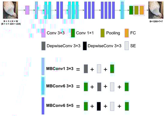 Figure 2 shows the structure of the feature extractor, where different colored blocks represent distinct operations. The notation Conv3×3 indicates a 3×3 convolution paired with a SiLU activation function and batch normalization (BN) layer. The MBConv block consists of three substructures: MBConv1×1, MBConv3×3, and MBConv5×5, where the numbers 3 and 5 represent the kernel sizes in the depth-wise separable convolutions. Modules of the same color represent identical operations.