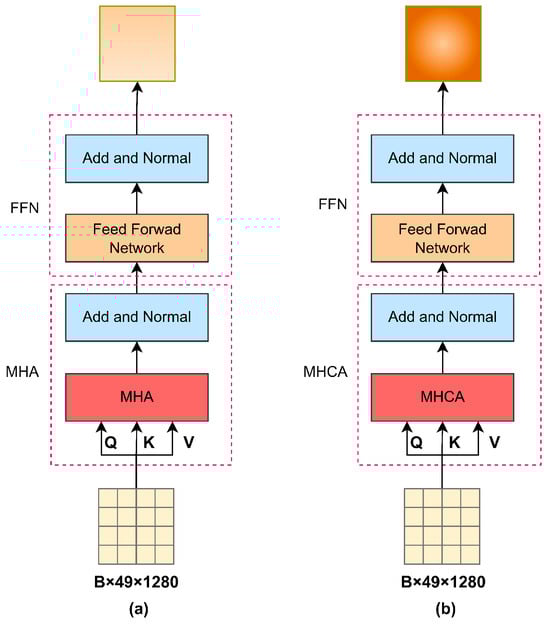 Comparison of encoders. Note: (a) represents the standard Transformer as an encoder and (b) represents our proposed concentrated encoder. The main difference between the two is the use of MHCA and MHA.