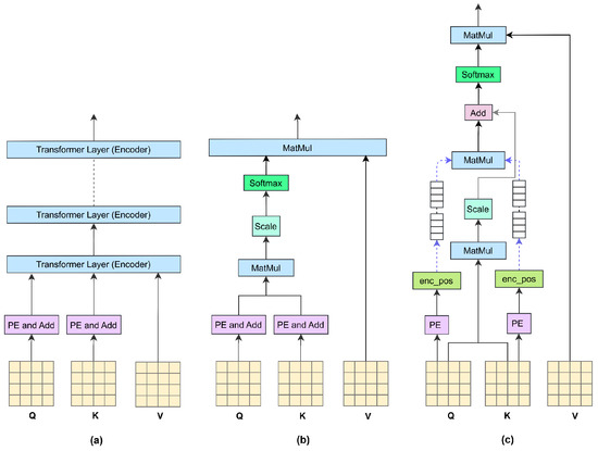 Comparison of positional encoding methods. Note: (a) represents the position coding method of the original Transformer, (b) represents the improved additive coding method, and (c) represents the multiplicative coding method proposed by us.