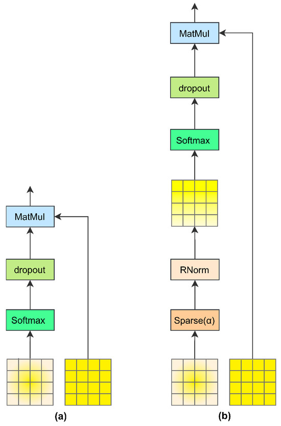 However, not all objects in poultry images exhibit strong correlations, which also applies to poultry representations. Computing pixel-wise similarity may introduce noise, compromising the accuracy of visual representations. In addition, traditional softmax normalization may fail to distinguish between objects in poultry images effectively. To overcome these challenges, inspired by Han et al. [21], we propose a learnable sparse mechanism that enhances the process in two key aspects. The overall workflow is illustrated in Figure 5, where Figure 5a represents the standard Transformer approach and Figure 5b highlights the improvements achieved by integrating the sparse mechanism.