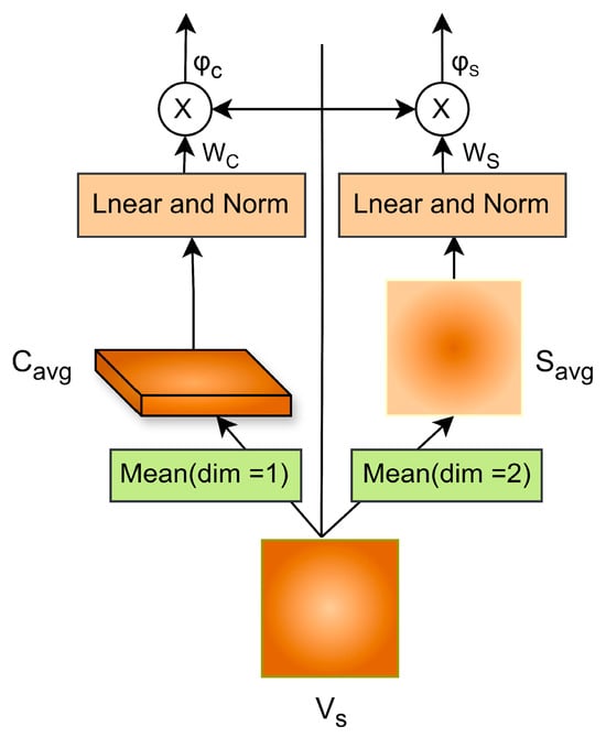 Subsequently, channel attention weights are obtained through learned weight parameters to capture scale diversity, which refines by focusing on entire spatial regions, resulting in channel attention features (), as shown in Equation (18):
