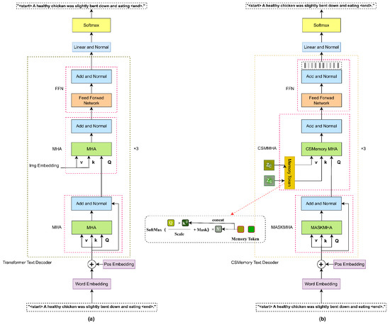 The memory description decoder’s architecture mirrors the encoder’s, with three stacked standard Transformer layers. However, unlike the encoder, the decoder employs a masked multi-head self-attention mechanism (MASKMHA) to compute attention scores for each word, replacing the standard MHA with a memory multi-head self-attention layer (CSMMHA). Figure 8 compares the standard Transformer decoder (a) with the memory description decoder (b).