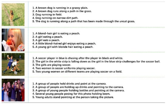 - Hodosh, M.; Young, P.; Hockenmaier, J. Framing image description as a ranking task: Data, models and evaluation metrics. J. Artif. Intell. Res. 2013, 47, 853–899. [Google Scholar] [CrossRef]