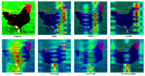 As shown in Figure 13, the classification decoder of the baseline model focuses most of its attention on the body of the chicken. After incorporating HSPC, irrelevant information or pixels unrelated to the chicken’s behavior are significantly filtered out, demonstrating the effectiveness of HSPC in optimizing the model’s self-attention mechanism. Furthermore, with the addition of LSM, aided by learnable parameters and the RNorm function, more irrelevant pixels are eliminated on top of the HSPC, enhancing the model’s ability to discard extraneous information. After adding KFE, the model’s ability to capture local features improves as it begins to focus on key body joints involved in chicken movement. In the final PBC-Transformer model, attention is predominantly focused on the primary joints associated with the behavior—specifically the feet—which serve as key indicators of walking behavior, as one foot is typically lifted during movement.. PBC-Transformer effectively eliminates most irrelevant elements compared to the baseline model. Although some minor irrelevant features remain, as mentioned earlier, this is intentional, introducing slight noise (such as background elements or feather color) during caption generation to prevent overfitting.