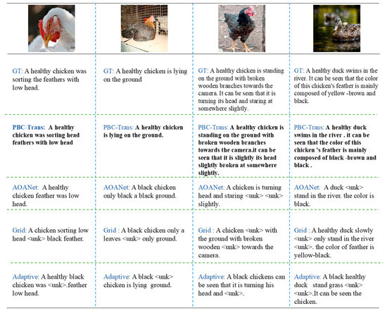 To evaluate PBC-Transformer’s effectiveness in the captioning task, we performed a qualitative comparison against AOANet, Grid, and AdaAtt models. Since there was minimal variation between the nine-class and three-class models, only the weights from the nine-class model were used for inference.