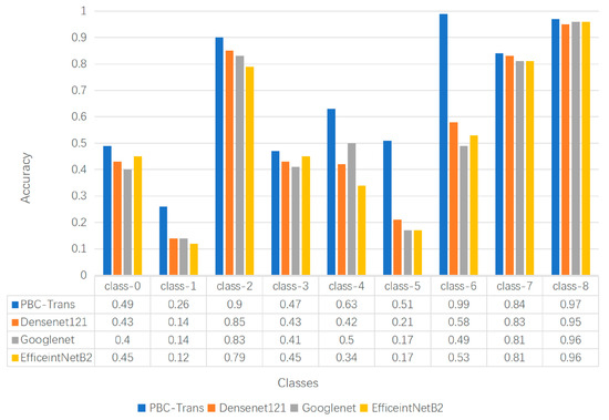 Figure 15 illustrates the performance comparison between the PBC-Transformer model and the comparison model on a 9-class classification task.. By leveraging multi-task learning and language-guided visual features, PBC-Transformer significantly outperformed traditional unimodal classification models.