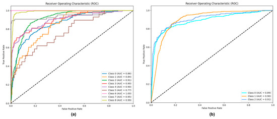 In the nine-class scenario, the AUC values for most categories exceed 86%, demonstrating strong robustness and low false-positive rates. However, the AUC values for categories 1 and 5 are 84% and 77%, respectively, which can be attributed to the limited sample sizes (215 for category 1 and 145 for category 5), restricting the model’s learning capability. In the three-class scenario, all AUC values surpass 89%, reflecting the balanced distribution of samples and the resulting enhanced performance.