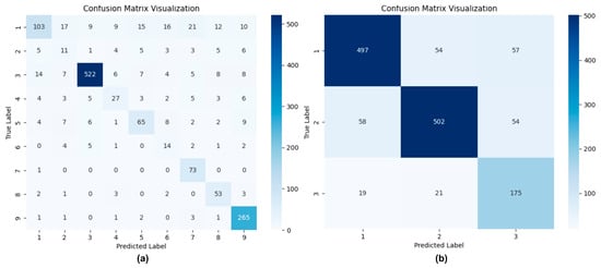 Confusion matrix visualization of PBC-Transformer’s inference results. Note: (a) represents the nine-class classification performance, while (b) corresponds to the three-class classification results.