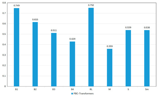 It is noteworthy that in the five categories with limited sample sizes—Class 1 (215 samples), Class 3 (286 samples), Class 5 (145 samples), Class 6 (370 samples), and Class 7 (316 samples).PBC-Transformer significantly outperformed traditional classification models. In Class 6, PBC-Transformer achieved a perfect accuracy of 100%. This demonstrates that PBC-Transformer overcomes the limitation of conventional models, which typically require large sample sizes to achieve high performance. PBC-Transformer proves that excellent predictive performance can be attained even with a small number of samples.
