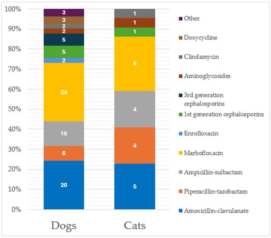 Distribution of antimicrobial administration considering the 92 specimens from patients under antibiotic treatment at the time of sampling. Classification is made considering separately the two species (73 from dogs and 19 from cats). Data labels are shown within the bars.