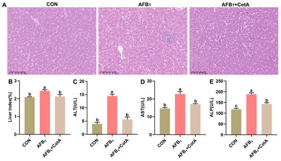 As depicted in Figure 1A, the liver histopathological sections from the CON group and the AFB1+CotA group displayed no notable pathological alterations, whereas the AFB1 group exhibited pronounced vacuolar degeneration within hepatocytes and notable inflammatory cell infiltration. The significant increase in the liver index of quails was also observed following AFB1 exposure (p < 0.05, Figure 1B). Moreover, serum ALT, AST, and ALP activities were significantly higher in the AFB1 group compared to the CON group (p < 0.05, Figure 1C–E), further indicating hepatocyte damage. Dietary supplementation with aflatoxin oxidase CotA protected quails from AFB1-induced hepatotoxicity, as indicated by the normalization of these key serum liver function biomarkers.