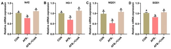 The mRNA expression of the transcription factor Nrf2 and its downstream genes in the liver of quails. (A–D) The relative expression of Nrf2, HO-1, NQO1, and SOD1. Values are expressed as mean ± SEM, and different lowercase letters indicate a significant difference at p < 0.05. CON = fed with basal diet; AFB1 = fed with basal diet + 50 μg kg−1 of AFB1; AFB1+CotA = fed with basal diet + 50 μg kg−1 of AFB1 + 1U kg−1 of aflatoxin oxidase CotA.