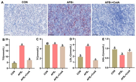 Effect of aflatoxin oxidase CotA on the hepatic lipid accumulation in Japanese quails fed with AFB1-contaminated diet. (A) Oil Red O staining of liver tissue sections. (B) Serum triglyceride (TG) content. (C) Serum total cholesterol (TC) content. (D) Serum low-density lipoprotein cholesterol (LDL-C) content. (E) Serum high-density lipoprotein cholesterol (HDL-C) content. Values are expressed as mean ± SEM, and different lowercase letters indicate a significant difference at p < 0.05. CON = fed with basal diet; AFB1 = fed with basal diet + 50 μg kg−1 of AFB1; AFB1+CotA = fed with basal diet + 50 μg kg−1 of AFB1 + 1U kg−1 of aflatoxin oxidase CotA.