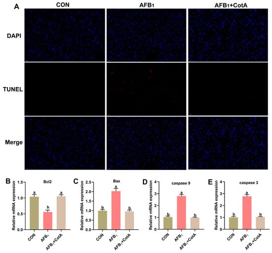The apoptosis rate in quail hepatocytes was detected via the TUNEL assay (Figure 4A). The AFB1 group exhibited a significant increase in apoptotic cells (positive-stained red) compared to the CON group. The addition of aflatoxin oxidase CotA to the AFB1 diet significantly reduced apoptotic cells in the liver. As shown in Figure 4B–E, compared with the CON group, the AFB1 group exhibited a significant increase (p < 0.05) in the mRNA expression levels of Bax, caspase-3, and caspase-9, while the expression of the anti-apoptotic gene Bcl-2 significantly decreased (p < 0.05). The addition of aflatoxin oxidase CotA significantly (p < 0.05) decreased the mRNA expression of Bax, caspase-3, and caspase-9 compared to the AFB1 group. The AFB1+CotA group exhibited a significant (p < 0.05) increase in the Bcl-2 mRNA expression level compared to the AFB1 group.