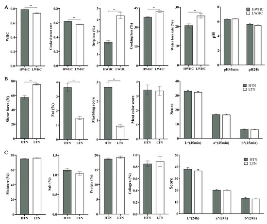 Comparative analysis of meat quality traits between different comparisons. (A) Comparison of WHC-related traits between the HWHC and LWHC groups, including cooked meat rate, drip loss, cooking loss, water loss rate, and pH. (B,C) Comparison of tenderness-related traits between the HTN and LTN groups, including shear force, fat content, marbling score, meat color score, moisture, salt, protein, collagen content, and colorimetric attributes. Note: double asterisks indicate extremely significant differences between the different groups (p < 0.01).
