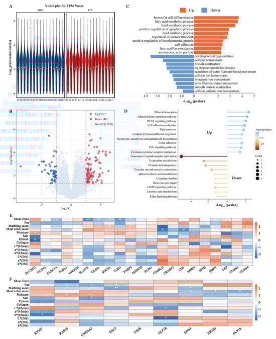 In the meat tenderness group, a total of 1,356,026,058 raw reads were produced. Following quality control, 1,333,674,286 clean reads were retained, with Q20 and Q30 quality values exceeding 98.72% and 96.31%, respectively (Table S1). To identify DEGs associated with meat tenderness, we performed a transcriptome comparison between the HTN and LTN groups. Gene expression distribution across biological replicates, visualized by violin plots (Figure 4A), demonstrated high reproducibility within groups. Comparative analysis identified 165 DEGs, including 117 up-regulated and 48 down-regulated genes in HTN relative to LTN (Figure 4B, Table S3). GO analysis showed that up-regulated DEGs were significantly enriched in processes related to lipid metabolism and skeletal assembly, including the “cellular lipid catabolic process”, “biological adhesion”, “cellular lipid metabolic process”, “fatty acid catabolic process”, “fat cell differentiation”, “skeletal myofibril assembly”, and “skeletal muscle thin filament assembly”. Down-regulated DEGs were predominantly linked to muscle function and energy metabolism, such as the “muscle system process”, “phasic smooth muscle contraction”, “cell-cell adherens junction”, and “energy reserve metabolic process” terms (Figure 4C).