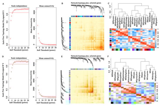 (A,D) Selection of soft threshold power for traits related to WHC and tenderness. (B,E) Cluster analysis of the relationships between different modules for traits related to WHC and tenderness, the darker the color, the higher the correlation. (C,F) Module gene correlation heatmap for traits related to WHC and tenderness.