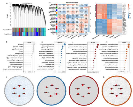 To investigate the molecular networks underlying meat water-holding capacity, WGCNA was performed. After determining an optimal soft threshold of 6 (Figure 6A), co-expression modules were constructed, revealing distinct clusters of genes with shared expression patterns (Figure 7A). The hierarchical clustering patterns and co-expression network correlations among distinct modules are visually represented through dendrogram and heatmap analysis in Figure 6B,C. Among these, the MEwhite and MEsteelblue modules exhibited significant positive correlations with WHC and the cooked meat rate but negative correlations with drip loss, cooking loss, and the water loss rate. Conversely, the MEbrown and MEsienna3 modules exhibited significant positive correlations with drip loss and cooking loss, and negative correlations with the cooked meat rate (Figure 7B). Based on gene significance (GS), we then selected the top genes from these modules for correlation analysis with meat quality traits. As shown in Figure 7C, genes in the MEwhite and MEsteelblue modules were positively correlated with WHC and the cooked meat rate, including MBIM1, PERM1, SAFB, and USP14. In contrast, genes in the MEbrown and MEsienna3 modules exhibited opposing expression patterns, such as MRPL41, PGGHG, and CORO1B. The functional enrichment analysis of these modules highlighted critical pathways linked to WHC regulation. Genes within the MEwhite and MEsteelblue modules were predominantly involved in metabolic processes and muscle development, such as the “GTP metabolic process”, “negative regulation of catabolic process”, “ATP biosynthetic process”, “contractile fiber part”, “myofibril”, “positive regulation of skeletal muscle tissue growth”, and “skeletal system morphogenesis” (Figure 7D,E). Genes in the MEbrown and MEsienna3 modules were significantly enriched in the “regulation of skeletal muscle cell differentiation”, “regulation of striated muscle tissue development”, “negative regulation of muscle tissue development”, and “membrane lipid biosynthetic process” terms (Figure 7F,G). Gene interaction network analysis further identified central hub genes with high connectivity, including ATP2C1, CACUL1, GSKIP, PATL1, MFSD11, LIMD1, RBM39, DDX3X, ASB5, ABCG2, SEMA3G, and CORO1B (Figure 7H–K).