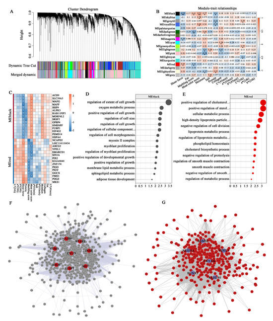 WGCNA analysis of tenderness-related traits. (A) Gene clustering dendrogram with color-coded modules. (B) Relationship between the module eigengene and tenderness-related traits. (C) The correlation between genes in key modules and tenderness-related traits. (D,E) GO enrichment analysis of genes in the MEblack and MEred modules. (F,G) Interaction network of genes in the MEblack and MEred modules. Note: asterisks indicate significant differences (p < 0.05), double asterisks indicate extremely significant differences (p < 0.01).