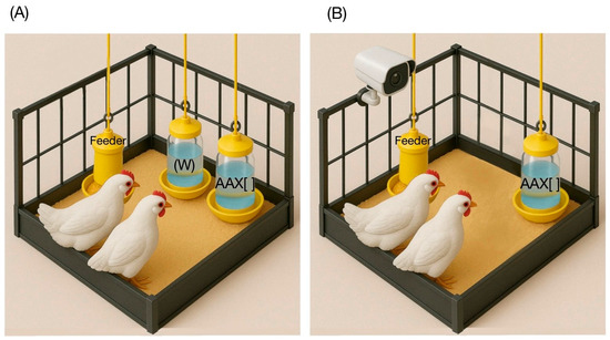 Upon arrival, the one-day-old birds were subjected to an initial phase of 7 days of acclimatization to the environmental conditions of the Poultry Unit prior to the start of the experimental tests on day 8 of life. The synthetic essential amino acids Lysine, Methionine, Threonine, and Tryptophan (purity > 99%; Veterquímica S.A., Santiago, Chile) were evaluated at 0.1%, 0.5%, 1%, and 1.5% concentrations. Delivery was carried out rotating for 16 days, determining that all amino acids were tested in all concentrations counterbalanced in each pen. Every test day started at 8:00 am with a 60 min water fasting period for the birds. The 32 pens were randomly divided into two groups and assigned to perform preference/SMI tests or acceptability/pecking cluster size tests. In the case of the former, at 9:00 am, two identical drinkers were positioned 20 cm apart (Figure 1A), with one containing plain drinking water (“W”) and the other containing an amino acid diluted in water at a specific concentration (amino acid × concentration, “AA × []”), following the previous literature [2,7,14,15]. Drinkers’ right/left placement was alternated daily to prevent preference biases related to the birds’ habituation. The second case offered a single drinker with a specific AA × [] combination (Figure 1B). For both methodologies, the test lasted 4 h each day. The weights of all drinkers were recorded before they were placed in the pens and again when they were taken out, allowing for the calculation of consumption by subtracting the amount remaining from the amount offered. The birds’ consumption was assessed based on their metabolic weight during the testing period, considering their age-related differences in body weight (BW). This was expressed in g/kg of BW and utilized to determine differential solution intakes.