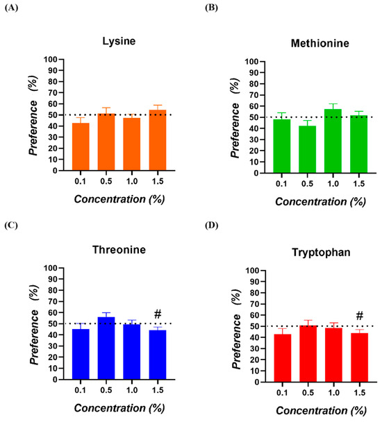 Preference of broiler chickens for (A) Lysine, (B) Methionine, (C) Threonine, and (D) Tryptophan. The dotted line (50%) indicates the neutral or lack of preference zone. (#) = values with a tendency towards significance (0.050 < p < 0.100).