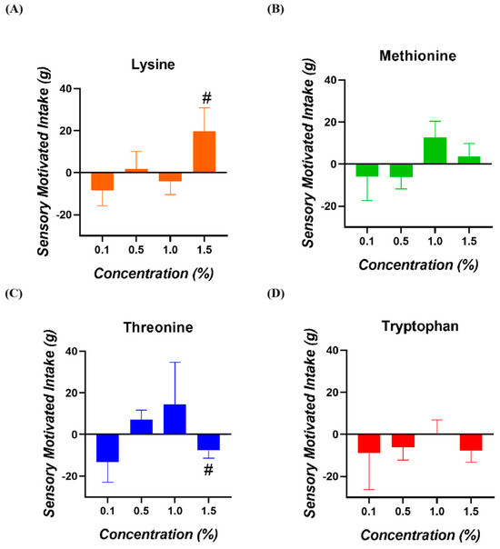 Sensory-motivated intake of broiler chickens for (A) Lysine, (B) Methionine, (C) Threonine, and (D) Tryptophan. (#) = values with a tendency towards significance (0.050 < p < 0.100).
