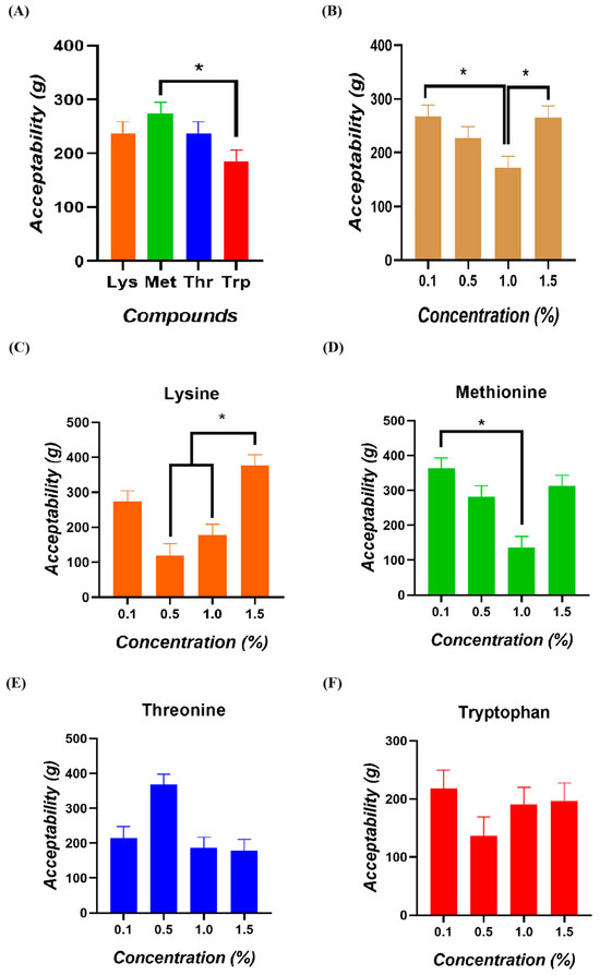 Acceptability of broiler chickens (A) among four amino acids, (B) four concentrations, and for (C) Lysine, (D) Methionine, (E) Threonine, and (F) Tryptophan. (*) = consumption values significantly different (p < 0.050).