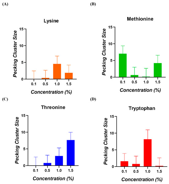 Pecking cluster size of broiler chickens for (A) Lysine, (B) Methionine, (C) Threonine, and (D) Tryptophan.