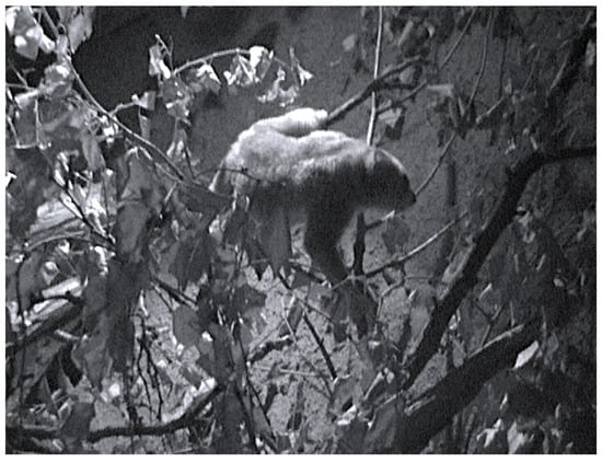 Regarding postural behavior, standing was the main posture of X. pygmaeus and included quadrupedal stances with both semi-extended and very flexed (crouch) limbs. This finding supported our initial prediction. Comparable standing percentages (67%) were observed in captive N. coucang []. In contrast, all other studies of lorisines demonstrated much lower proportions of standing. Tenaza et al. [] found that standing/crouching represented only 12.1% of postural behavior of captive N. coucang, whereas similar results were obtained for wild N. javanicus (18.5%) [] and wild N. bengalensis (10%) []. Equally low percentages have been also recorded for wild L. tardigradus (16.7% []) and wild L. lydekkerianus (9.9% []; 8.1%, []). Standing postures are usually related to more active behaviors, such as exploring, feeding, and pausing between locomotor bouts. In contrast, almost all studies on lorisines emphasize the use of sitting, representing up to 70% of all postural behaviors [,,,,]. This posture, especially in the form of a ball with the body hunched and the head erect between the knees, is related to longer and more stable bouts of inactivity, adopted during either resting, sleeping, or grooming behaviors. It is very likely that our sampling protocol underestimated it during our captive study. Since wild lorisines use this posture at sleeping sites for thermoregulation, during colder nights ([]; see also []), the stable environmental conditions in captivity likely reduced the need for comparable behavioral adaptations.