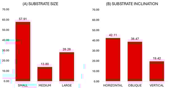 Despite the enriched arboreal environment, substrates in an artificial enclosure are always expected to limit the locomotor and postural options of caged animals. In this case, estimating substrate availability allows for a controlled, weighted test of substrate preference. We calculated all available substrates by unit and, subsequently, estimated the availability of the different size and inclination categories (see Table 1 for definitions). Small substrates dominated (44.6%), with medium and large ones ranking behind (31.4% and 24.0%, respectively). Regarding substrate inclination, oblique substrates were more abundant (53.1%), followed by horizontal (26.3%) and vertical ones (20.6%). Preference or avoidance of these categories was then estimated utilizing Jacobs’ index: D = U − A/U + A − 2U × A, where U is proportion of use and A is proportion of availability. Values of the index range from −1, depicting strong avoidance, to +1, showing strong preference, whereas values around 0 are considered as neutral [].