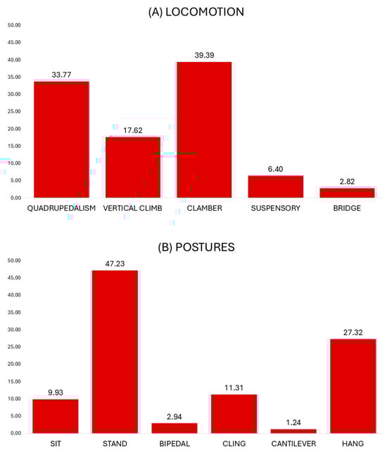 Locomotion, or active body displacement, and postures, or dynamic stability of the body, enable animals to interact effectively with their surrounding environment. The different modes of displacement and stance represent the locomotor and postural behavior, respectively, and are collectively referred to as positional behavior []. Positional behavior represents a crucial biological factor, as it provides access to and handling of food sources, helps escape from predators, enables dominance and territorial displays, and facilitates active searching and interaction with potential mates, contributing to reproduction and survival []. Thus, studies of positional behavior are central to animal biology, elucidating how animals behaviorally adapt to their environments. These eco-mechanical variables present biological information that is important for advances in evolutionary and adaptive morphology, fossil reconstruction, life history traits, and ecology []. From an evolutionary-adaptive perspective, studies of positional behavior are integral to interpreting how organismal and ecological traits have evolved to help animals increase their fitness, thereby interacting within the constraints of their environment. In addition to traditional evolutionary analyses, considering the relationship between positional behaviors and effective habitat use in conservation terms is critical [,]. It informs how animals respond to varying environmental conditions to survive and reproduce []. Consequently, this information can be vital for conservation planning, habitat management, and captive breeding or reintroduction programs [,,,].