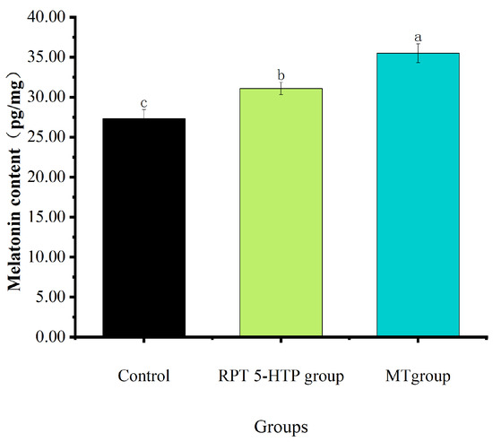 As shown in Figure 1, compared with the control group, supplementation with RPT 5-HTP and MT significantly increased the MT content in the longissimus dorsi muscle of Hu sheep (p < 0.05).
