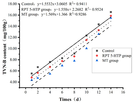 By determining the TVB-N content in meat samples stored at 4 °C at different time intervals (1, 2, 4, 6, 8, 10, and 12 days), and taking the time when TVB-N reaches 15 mg/100 g as specified in the national food safety standard GB 2707-2016 [24] as the standard, the linear equations of TVB-N content for the control group, RPT 5-HTP group, and MT group were obtained through the standard curve. Subsequently, the specific time for the TVB-N value of each group to reach 15 mg/100 g was further calculated.