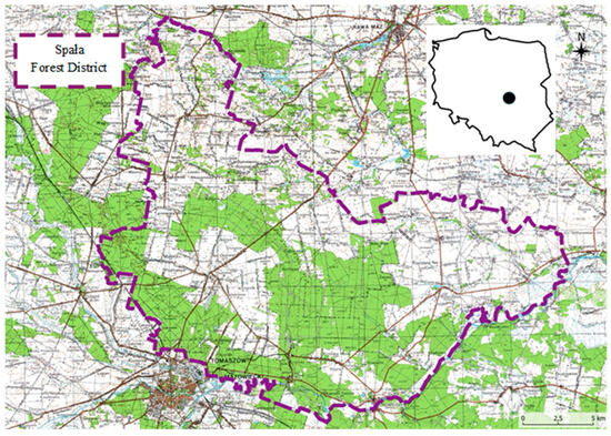Data for research on the dynamics of damage caused by wild boar come from the hunting ground administered by the State Forest Service in the Spała Forest District (SFD) in central Poland (Figure 1).