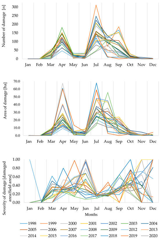 Three characteristics of damage—the number of reports, the area of damage, and the severity of damage—exhibited high monthly dynamics throughout the year (Figure 2).