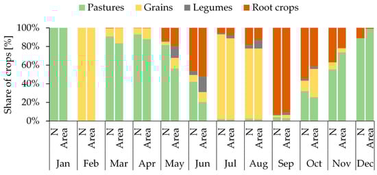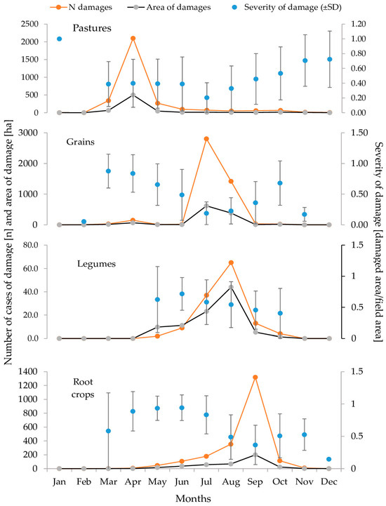 The monthly dynamics of damage were evident not only in total data but also across crop categories: pastures, grains, legumes, and root crops. Notably, the peak of the damage wave shifted over time and across crop types (Figure 3). This phenomenon was apparent in the number of reported cases of damage and damaged areas but not in the seasonal dynamics of damage severity.