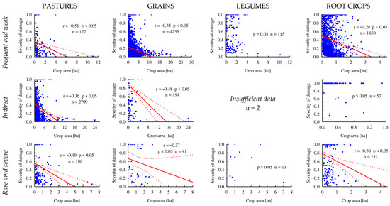 The average area of LEGUMES crops was 0.73 ± 1.10 ha, with an average damage severity of 55% (0.55 ± 0.36). The correlation between field size and damage severity was not statistically significant (r = −0.04, p > 0.05). This was consistent across all quantitative–qualitative damage patterns. During the first half of the year, when damage was rare but severe, 13 cases of LEGUMES damage were recorded, with an average field size of 1.76 ± 1.92 ha. The average damage severity was 62% (0.62 ± 0.33) and showed no significant correlation with field size (r = −0.07, p > 0.05). During periods of frequent and weak damage, 115 cases were recorded in LEGUMES, with an average field size of 1.26 ± 1.26 ha. The average severity was 55% (0.55 ± 0.36), again without a significant correlation between these variables (r = −0.06, p > 0.05). Damage during the indirect pattern occurred only twice, affecting large fields (average 5.62 ± 6.00 ha), which were neither representative of the category nor numerically sufficient to assess the relationship.