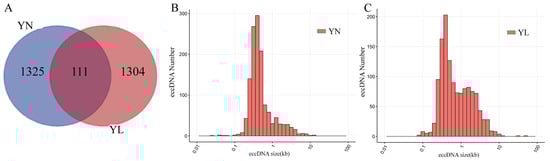 There were 1325 and 1304 different eccDNAs in the YN and YL groups, respectively (Figure 1A). The lengths of differential eccDNAs also differ between the two groups in this study (Figure 1B,C). The length of differential eccDNAs in the YN and YL groups was mainly distributed between 0.1–10 kb, while that in the YN group was concentrated between 0.1 and 1 kb. However, the length of differential eccDNAs in the YL group was between 1–10 kb more than that in the YN group. Longer eccDNAs can carry longer functional genome segments.