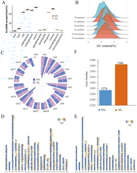Chromosomal distribution of eccDNAs and gene annotation of eccDNAs. (A) Proportional representation of differential eccDNAs across genomic functional regions. (B) The analysis of the GC content of differential eccDNAs and their upstream and downstream regions with equivalent lengths (1000 bp) from the YN and YL groups. Downstream: represents the downstream region of eccDNA; eccDNA: represents the entire coordinate interval of eccDNA; upstream: represents the upstream region of eccDNA. (C) Differences between the YN and YL groups eccDNA distribution numbers on chromosomes. (D) The chromosomal distribution of differential eccDNAs in the YN group. (E) The chromosomal distribution of differential eccDNAs in the YL group. The depth of chromosome color represents gene density, while varying shades of orange indicate the number of differential eccDNAs on the chromosome, with higher shades indicating a greater abundance of differential eccDNAs. (F) The number of annotated genes associated with differential eccDNAs.