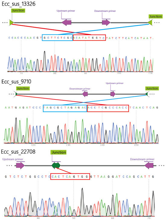 Circular validation of eccDNA was conducted by randomly selecting ecc_sus_13326, ecc_sus_9710, and ecc_sus_22708. Specific primers were designed to amplify sequences containing cleavage sites via PCR, followed by the validation of PCR products using Sanger sequencing (Table 1). The results demonstrate that the cleavage sites of these three eccDNAs were successfully amplified, which is consistent with our Circle-seq results (Figure 3).