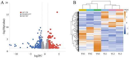 Transcriptome sequencing results. (A) Volcano plot of DEGs (up: genes expression was higher in the YN group than in the YL group, down: genes expression was lower in the YN group than in the YL group). (B) Heatmap of clustered DEGs.