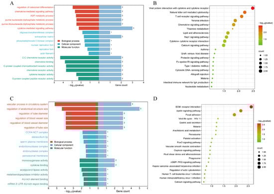 The KEGG and GO enrichment analysis results of the two groups of eccDEGs are shown in Figure 5. Pathways enriched in the YN group include viral protein interaction with cytokine and cytokine receptors, chemokine signaling pathway, and lipid and atherosclerosis (Figure 5B). Significantly enriched GO terms in the biological processes (BPs) include the ADP metabolic process, the purine nucleoside diphosphate metabolic process, and the cytokine-mediated signaling pathway (Figure 5A). Pathways enriched in the YL group include the Apelin signaling pathway, arachidonic acid metabolism, and the FoxO signaling pathway (Figure 5D). Significant GO terms in the BPs include the vascular process in the circulatory system and the regulation of tube diameter (Figure 5C).