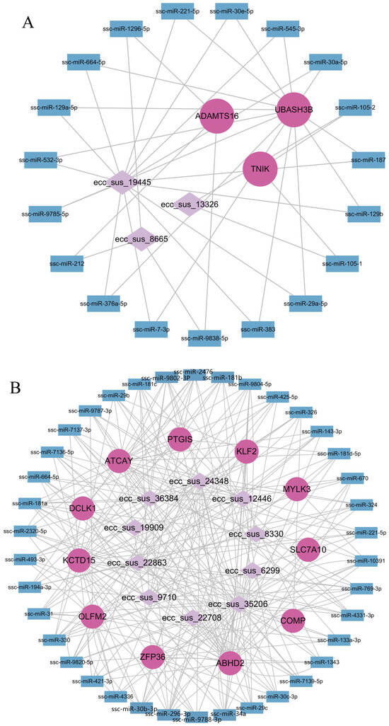 Porcine miRNA sequences were extracted from the miRBase database (http://www.mirbase.org/, accessed on 15 August 2024), and the 3′UTR sequences of the genes were retrieved from UCSC (https://genome.ucsc.edu/, accessed on 15 August 2024). The miRanda (v.3.3a) software (https://www.bioinformatics.com.cn/local_miranda_miRNA_target_prediction_120, accessed on 2 June 2024) was used to predict pig miRNAs that might interact with eccDNAs and their target genes. The prediction was performed using the default parameters of the system. Cytoscape (v.3.10.1) was used for visualization.