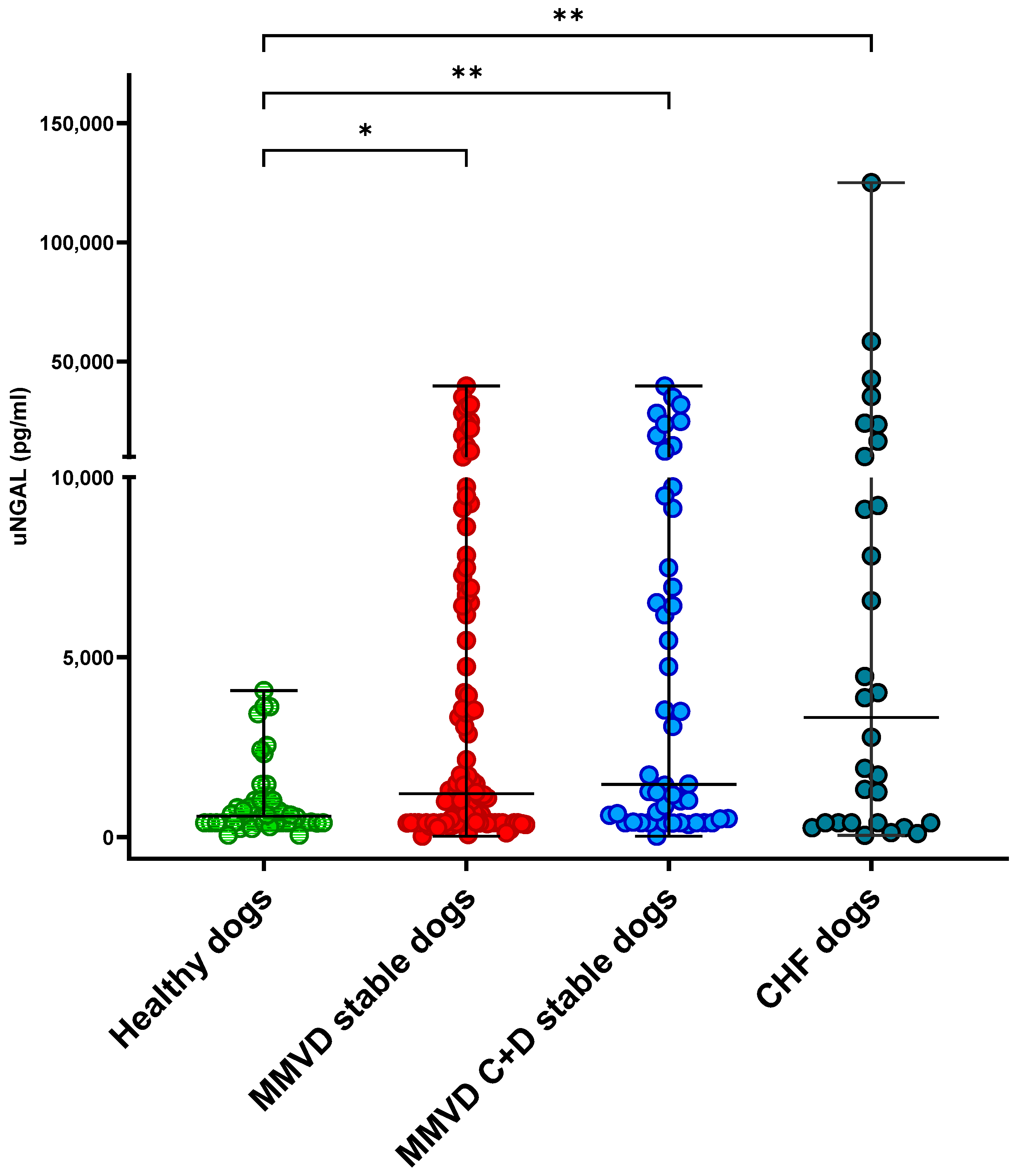 Figure 2). No statistically significant differences were detected when the uNGAL and uNGALC values were compared between the CHF dogs and stable MMVD dogs in stage ACVIM C only (