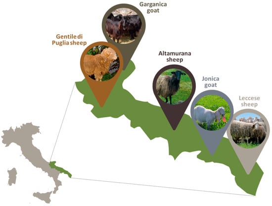 Apulia’s small ruminant biodiversity is enriched by different autochthonous sheep and goat breeds, including Gentile di Puglia, Altamurana, and Leccese sheep breeds and Garganica and Jonica goat breeds, which have a prevalent geographical localization in Apulia region (Figure 1).