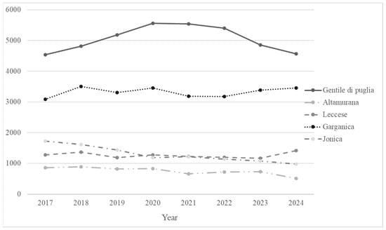 In 1983, the Gentile di Puglia breed population was estimated at 500,000 head. Nowadays, the last census conducted by the Italian national association of sheep and goat-breeders [32] reported a population of about 4500 herd book-registered animals (Figure 2), including 550 rams and 3900 ewes. This breed is classified as vulnerable by the Domestic Animal Diversity Information System (DAD-IS) of FAO (https://www.fao.org/dad-is/browse-by-country-and-species/en/; accessed on 19 May 2025). Historically, Gentile di Puglia sheep were reared under a transhumant pastoral system, characterized by seasonal migrations; from October to May, sheep grazed on the extensive pastures of the flatlands of Tavoliere delle Puglie, while during the summer months (June to September), they were moved to the mountainous regions of Molise and Abruzzo in search of more favorable climatic and nutritional conditions. For centuries, this breed has been a symbol of transhumant livestock management, closely linked to traditional rural infrastructure and cultural practices [33].
