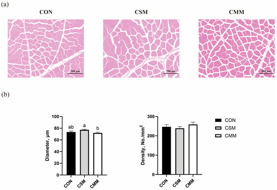 Effect of mixed meal replacement of soybean meal on the longissimus thoracis fiber density and diameter of finishing pigs. (a) H&E staining of longissimus thoracis magnification × 12. (b) myofiber density and diameter. CON, the control group was fed a corn–soybean meal basal diet; CSM, the corn–soybean mixed meal group was fed with mixed meal to partially replace soybean meal in the basal diet; CMM, the corn mixed meal group was fed with mixed meal as a complete replacement of soybean meal in the basal diet. Values are means ± SEM, n = 6. Labeled means in a row with different letters differ, p < 0.05.