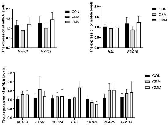Effect of mixed meal replacement of soybean meal on the type of muscle fiber, fat metabolism, and intramuscular fat deposition genes in the longissimus thoracis of finishing pigs. MYHC1, myosin heavy chain 1; MYHC2, myosin heavy chain 2; ACACA, fatty acid synthesis-related gene acetyl-CoA carboxylase alpha; FASN, fatty acid synthase; CEBPA, CCAAT enhancer binding protein alpha; FTO, FTO alpha-ketoglutarate-dependent dioxygenase; FATP4, solute carrier family 27 member 4; PPARG, peroxisome proliferator activated receptor gamma; PGC1A, PPARG coactivator 1 alpha; HSL, hormone-sensitive lipase; PGC1B, PPARG coactivator 1 beta. CON, the control group was fed a corn–soybean meal basal diet; CSM, the corn–soybean mixed meal group was fed with mixed meal to partially replace soybean meal in the basal diet; CMM, the corn mixed meal group was fed with mixed meal as a complete replacement of soybean meal in the basal diet. Values are means ± SEM, n = 6.