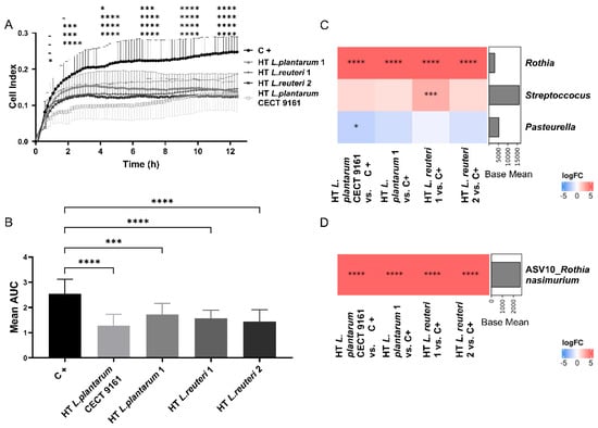 Influence of HT L. plantarum CECT 9161 on growth and microbial composition of biofilms from canine saliva. (A) Quantification of biofilm formation over a 12 h incubation period from canine saliva samples (N = 12) determined by impedance data from the xCELLigence RTCA assay. HT L. plantarum CECT 9161 demonstrated a significant decrease in the Cell Index curve. Mean (± SD for 12 replicates) represented at each timepoint. (B) AUC analysis of xCELLigence RTCA assay data on biofilm growth presented in (A). HT L. plantarum CECT 9161 shows the greatest reduction in biofilm growth. Statistical significance was tested in GraphPad Prism using a one-way ANOVA with Dunnett’s post hoc analysis. * p < 0.05, *** p < 0.001, **** p < 0.0001. LogFC of deferentially abundant bacterial taxa of the DNA obtained from biofilms grown (A) at genus (C) and ASV level (D). Red on the heatmap indicates that the bacteria had a higher abundance in the postbiotic than the control (C+) and blue indicates a lower abundance. Statistical analysis was tested in R with the “limma-voom” package using its internal moderated t-test. * p < 0.05, *** p < 0.001, **** p < 0.0001. ASV, amplicon sequence variants; AUC, area under the curve; C+, control; DNA, deoxyribonucleic acid; h, hours; HT L. plantarum CECT 9161, heat-treated Lactiplantibacillus plantarum CECT 9161; HT L. plantarum 1, heat-treated Lactiplantibacillus plantarum 1; HT L. reuteri 1, heat-treated Lactiplantibacillus reuteri 1; HT L. reuteri 2, heat-treated Lactiplantibacillus reuteri 2; logFC, log fold change; RTCA, Real-Time Cell Analysis; SD, standard deviation.
